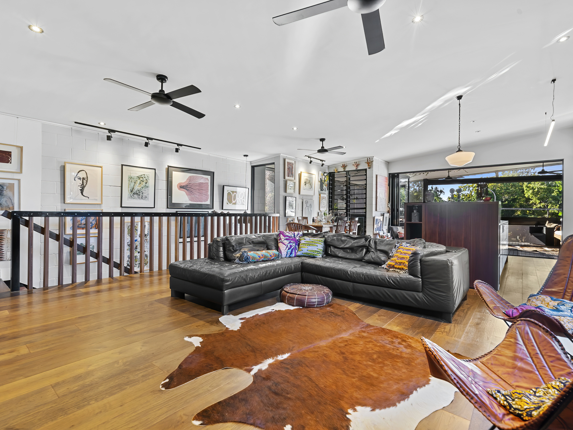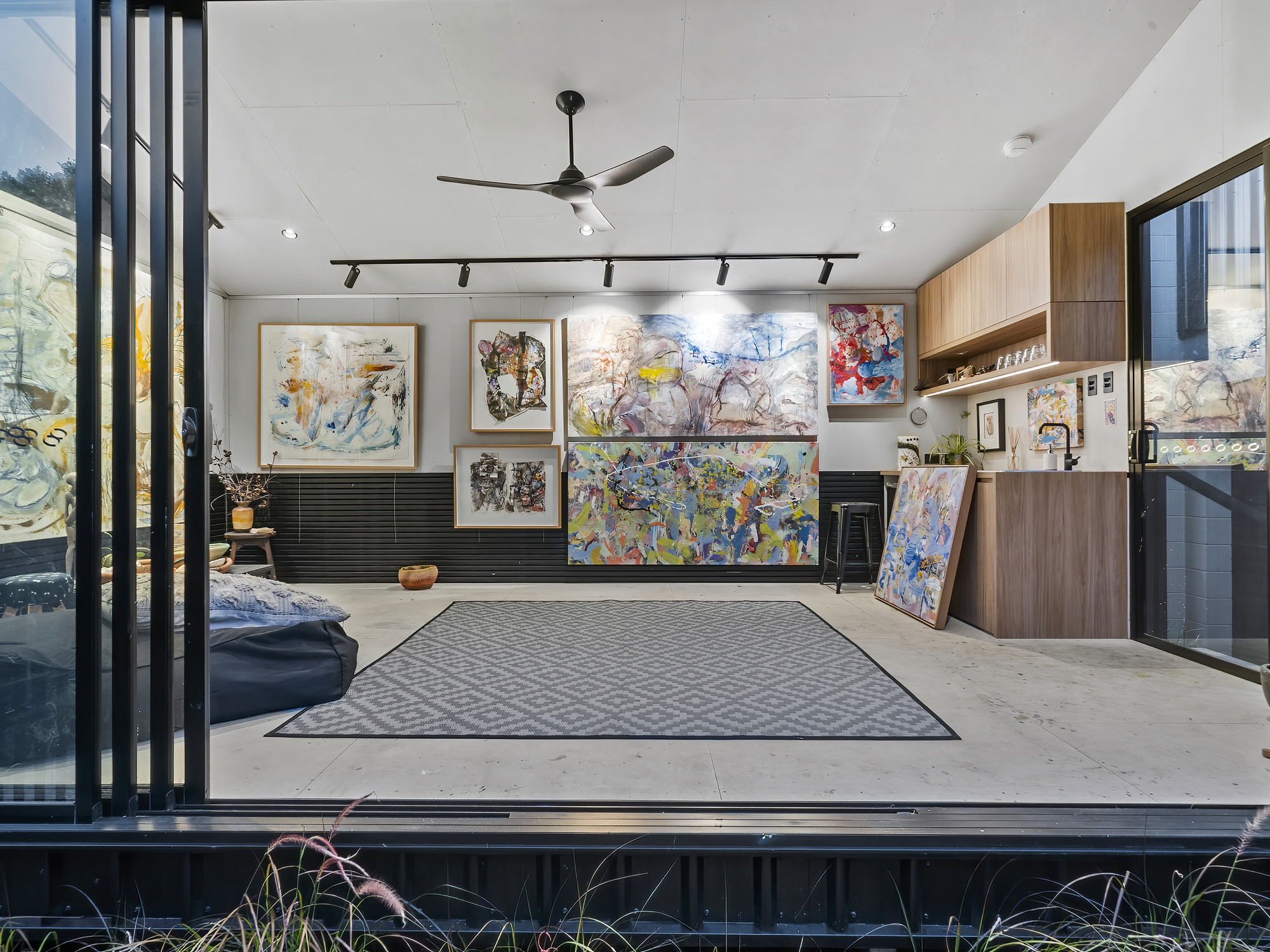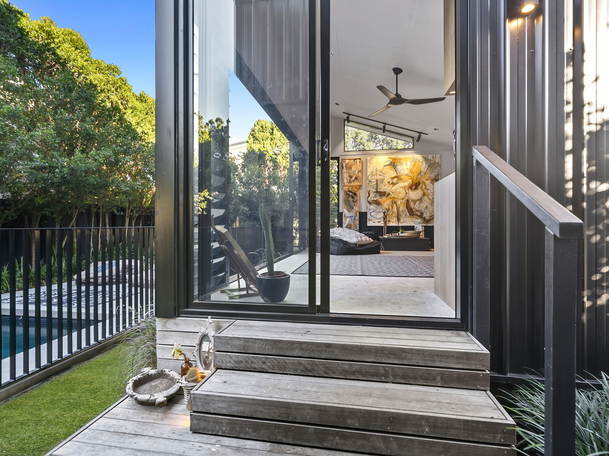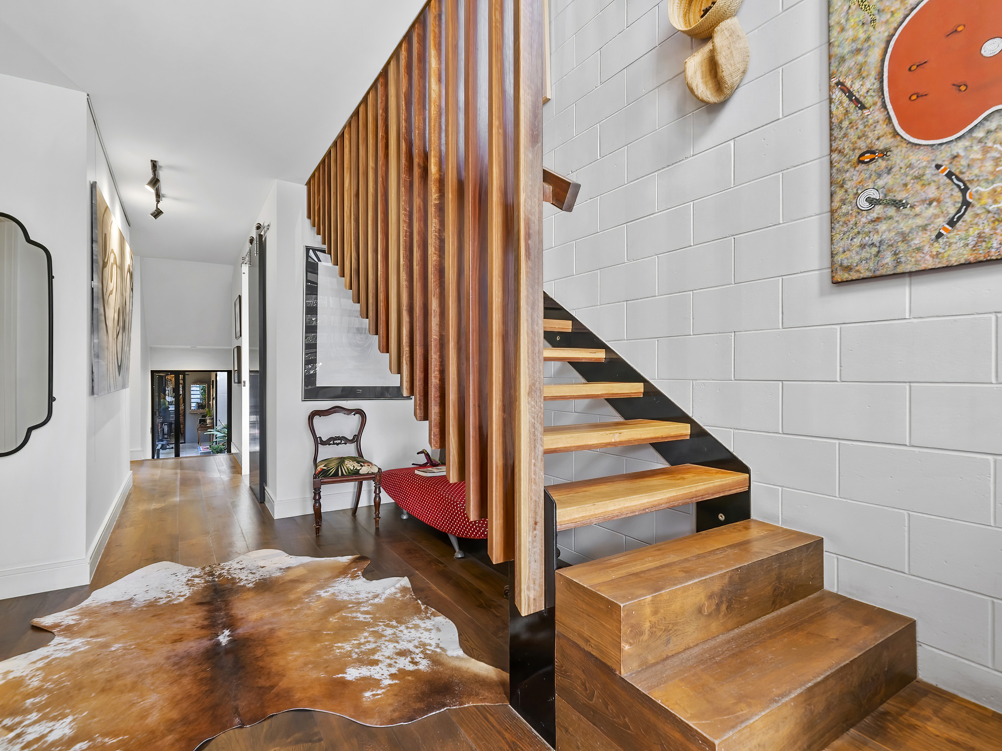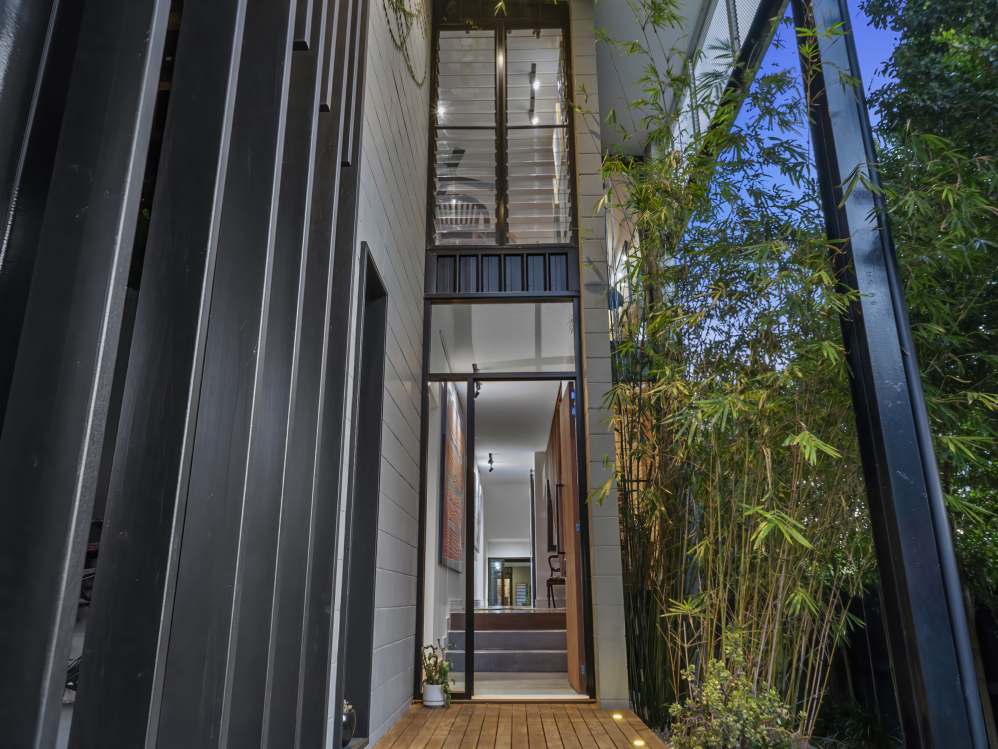 Entering through the gate, you'll find a picturesque garden landscaped by John Hope, featuring pandanus, banksias, pavers, and mondo grass. Adorned inside are the polished concrete floors and high-ceilinged hallway that are immediately striking, with distinctive art, design and construction elements that reflect Georgina Price's creative vision.