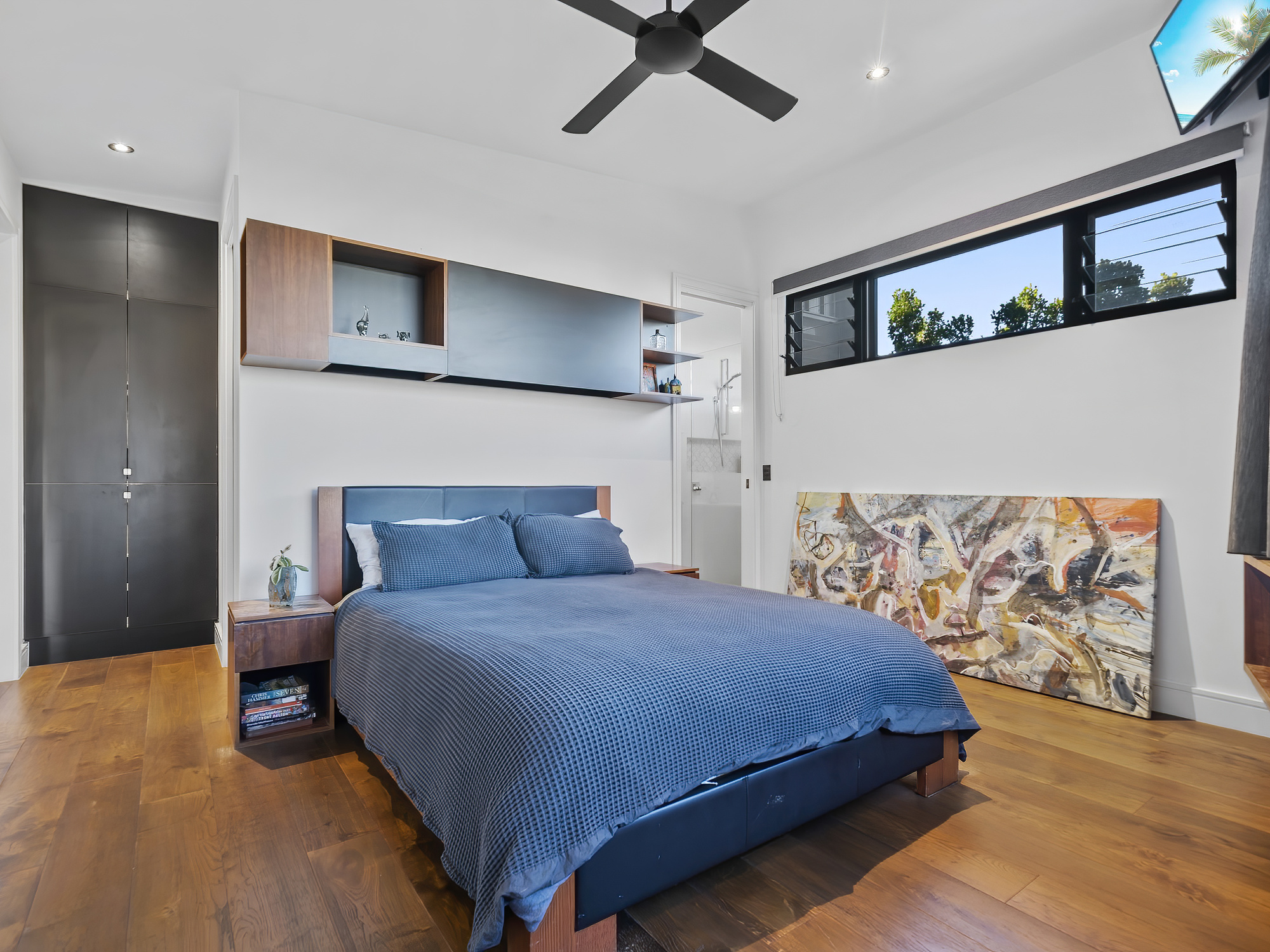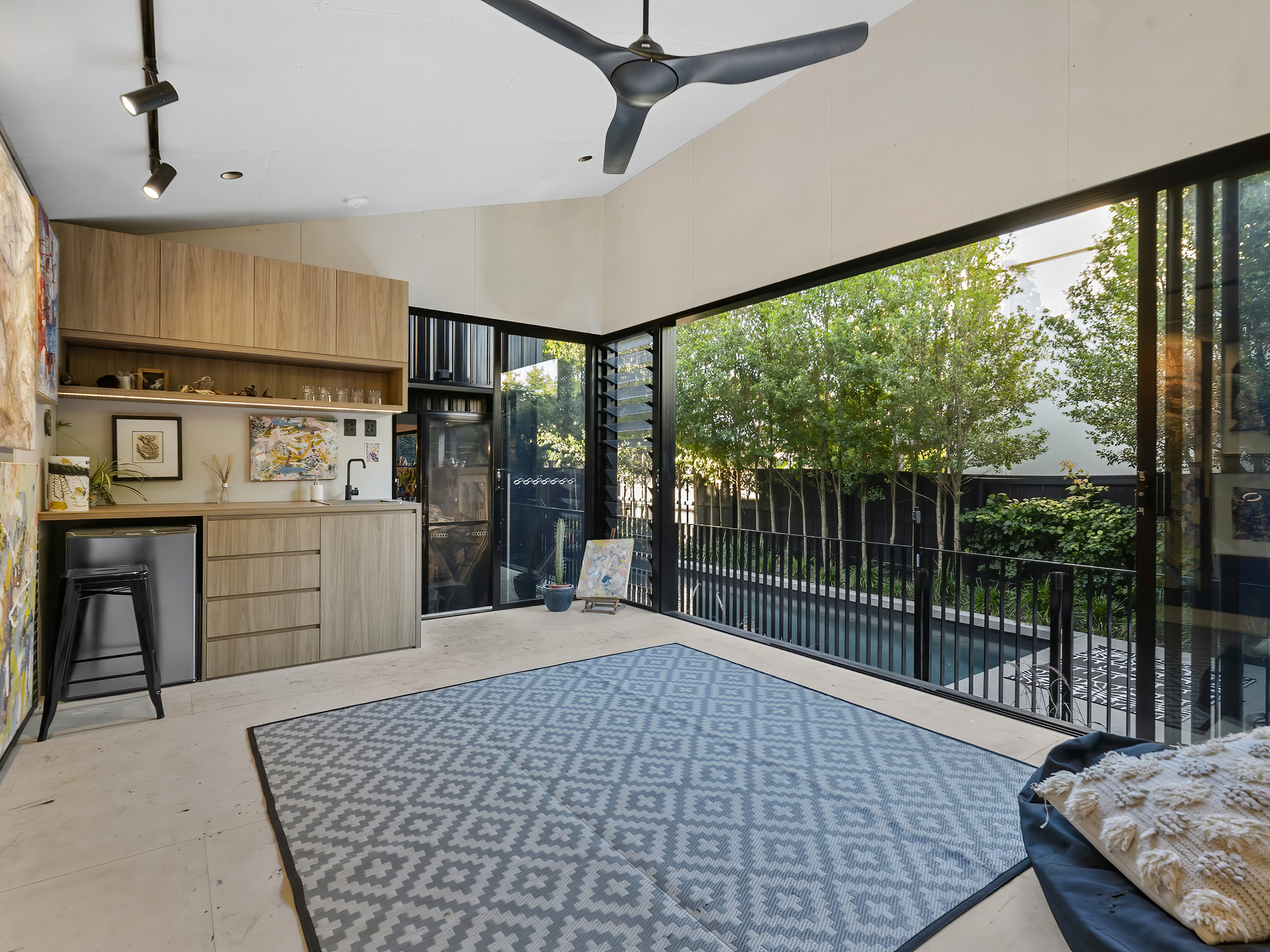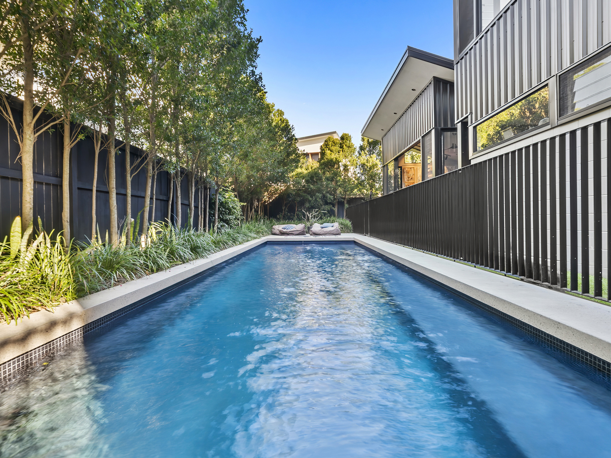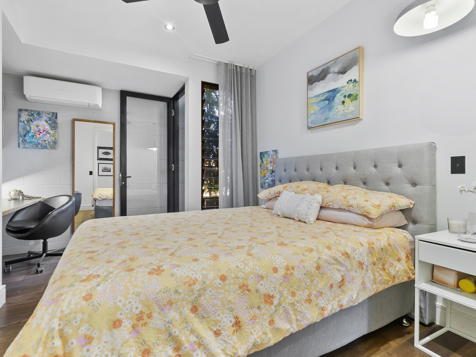 Entering through the gate, you'll find a picturesque garden landscaped by John Hope, featuring pandanus, banksias, pavers, and mondo grass. Adorned inside are the polished concrete floors and high-ceilinged hallway that are immediately striking, with distinctive art, design and construction elements that reflect Georgina Price's creative vision.