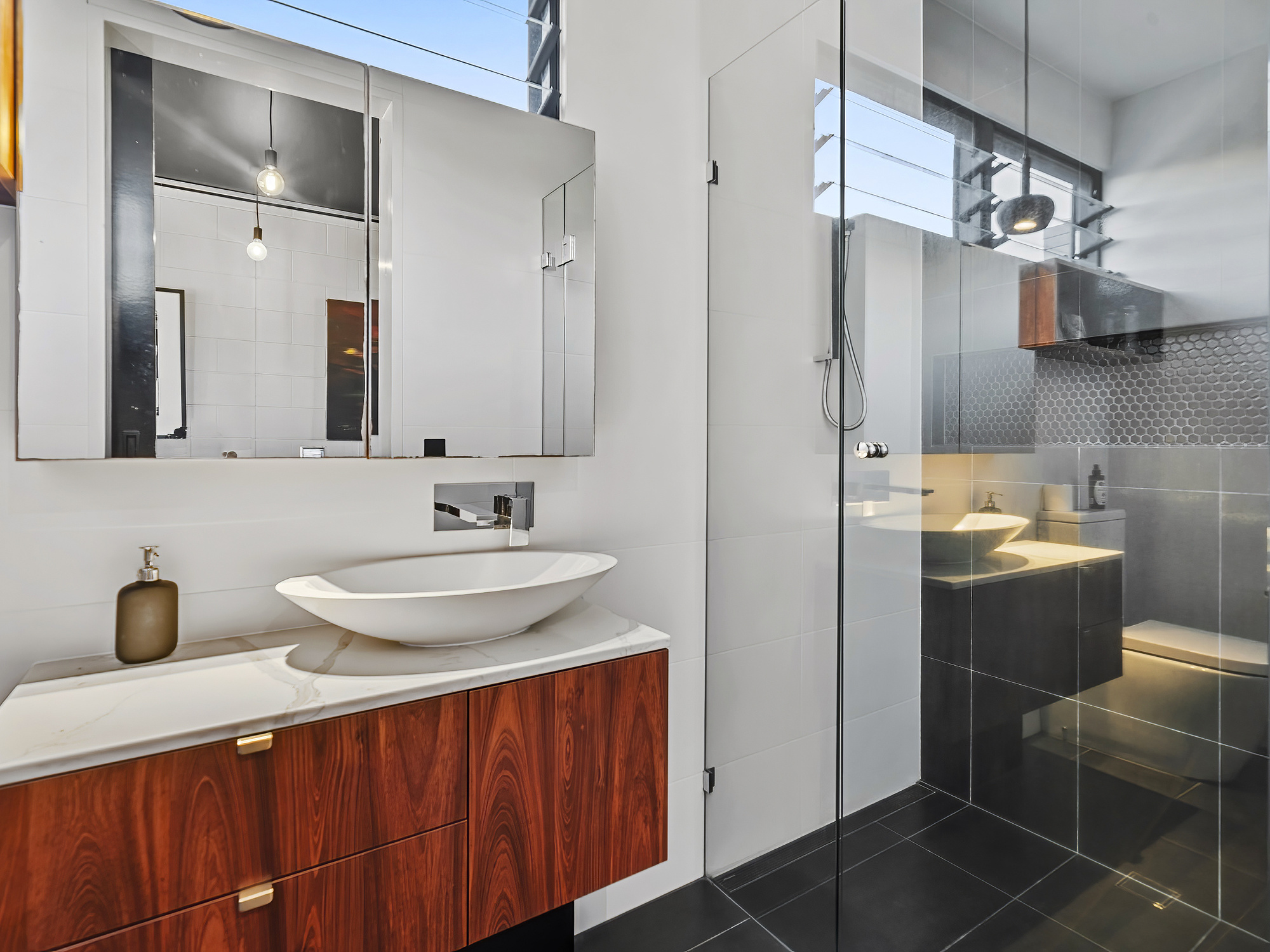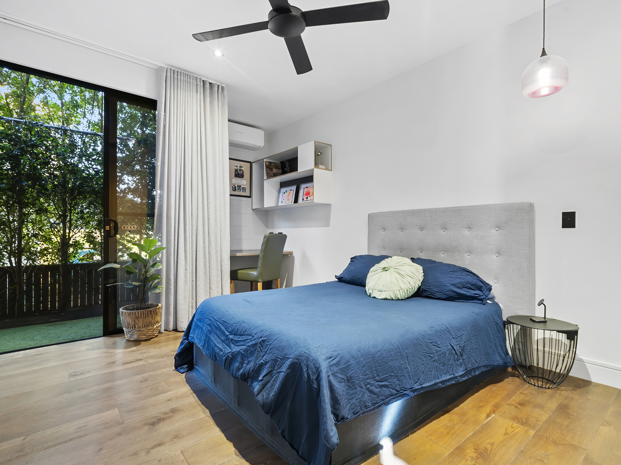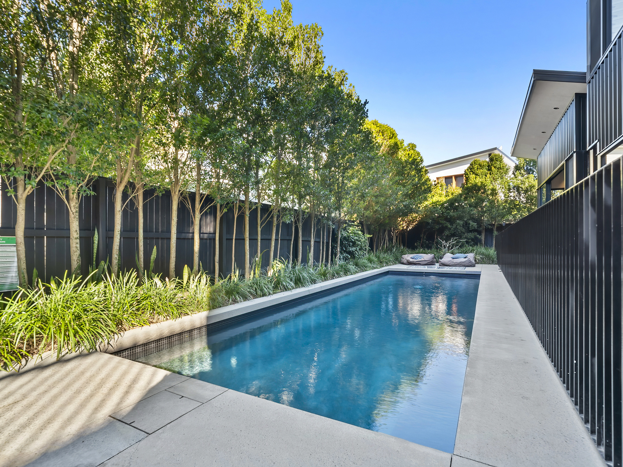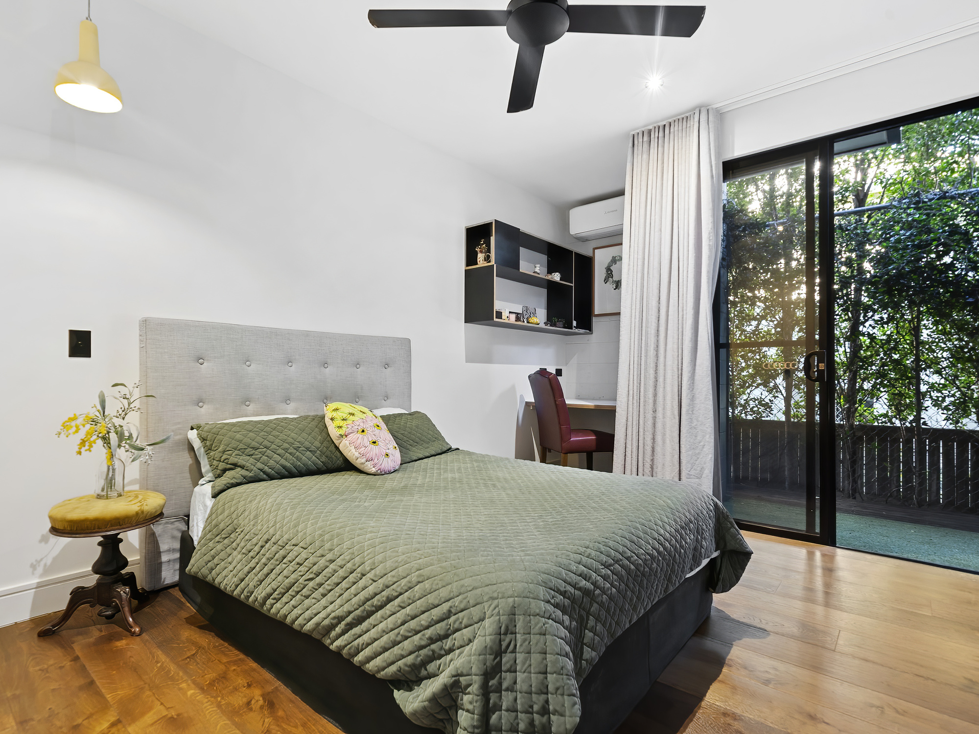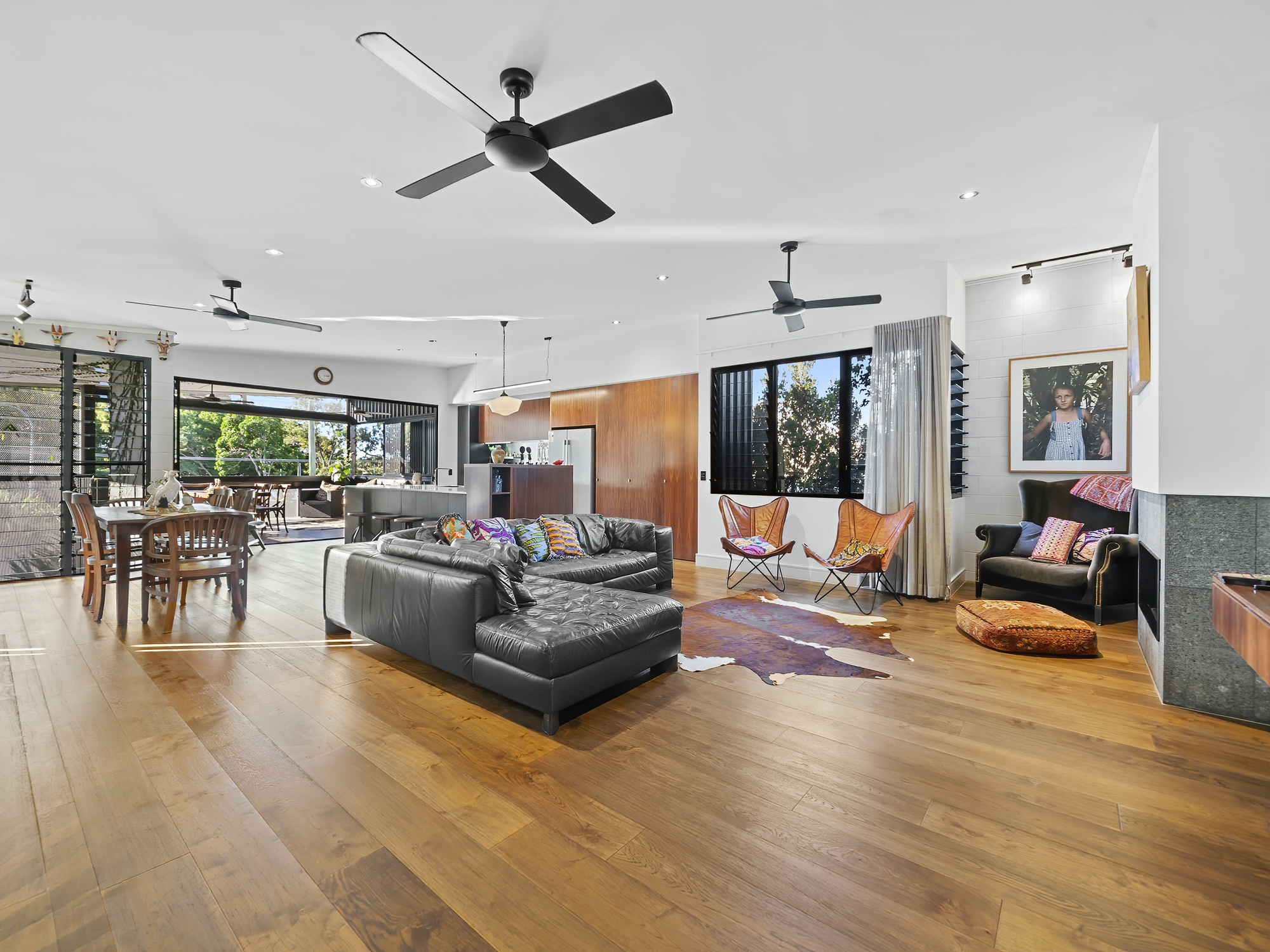 Entering through the gate, you'll find a picturesque garden landscaped by John Hope, featuring pandanus, banksias, pavers, and mondo grass. Adorned inside are the polished concrete floors and high-ceilinged hallway that are immediately striking, with distinctive art, design and construction elements that reflect Georgina Price's creative vision.