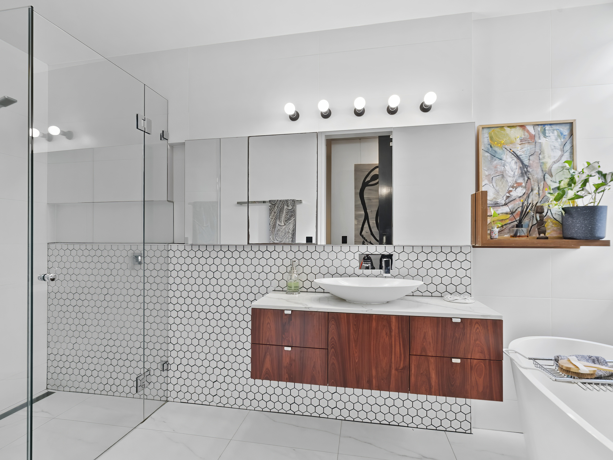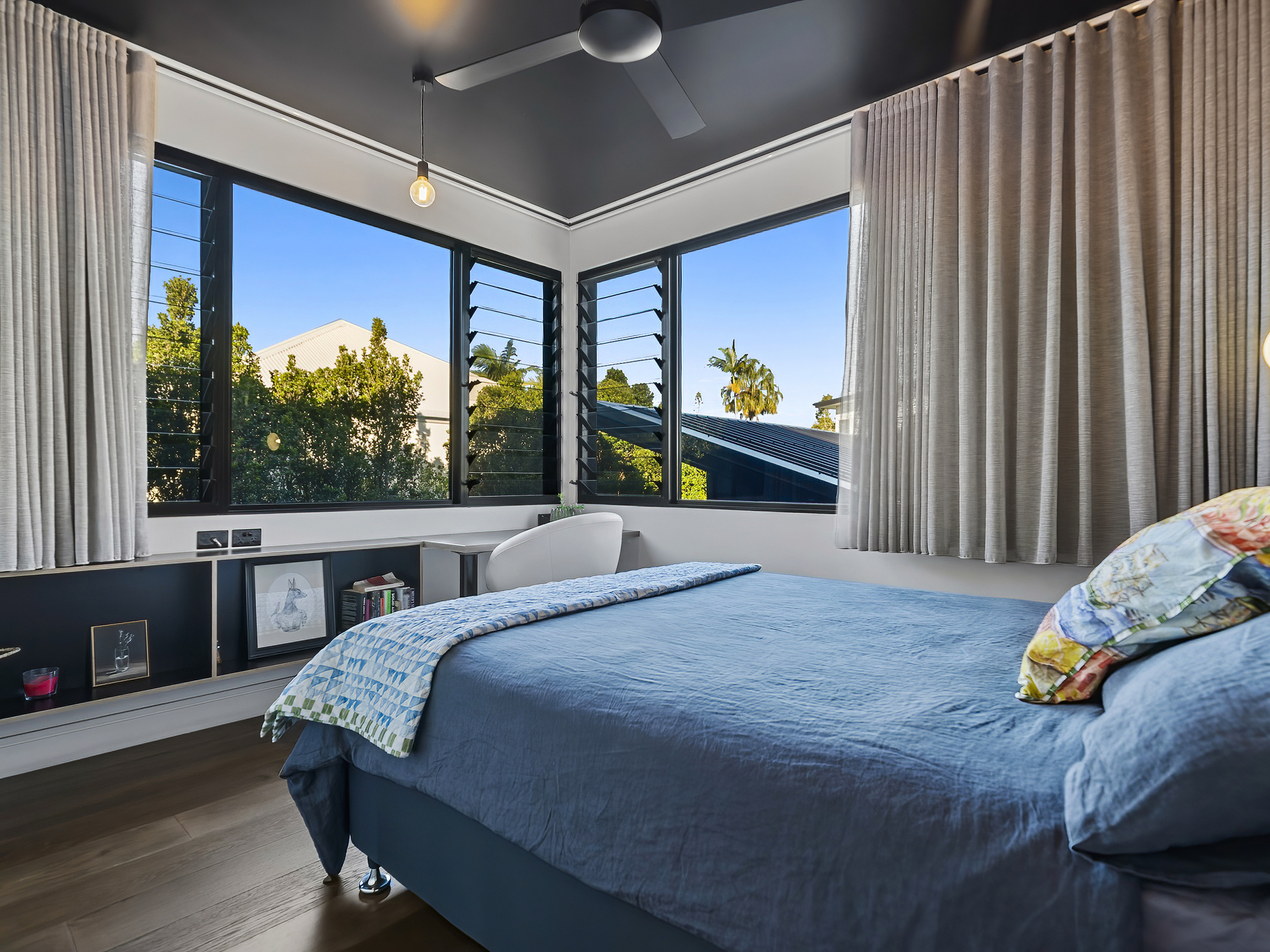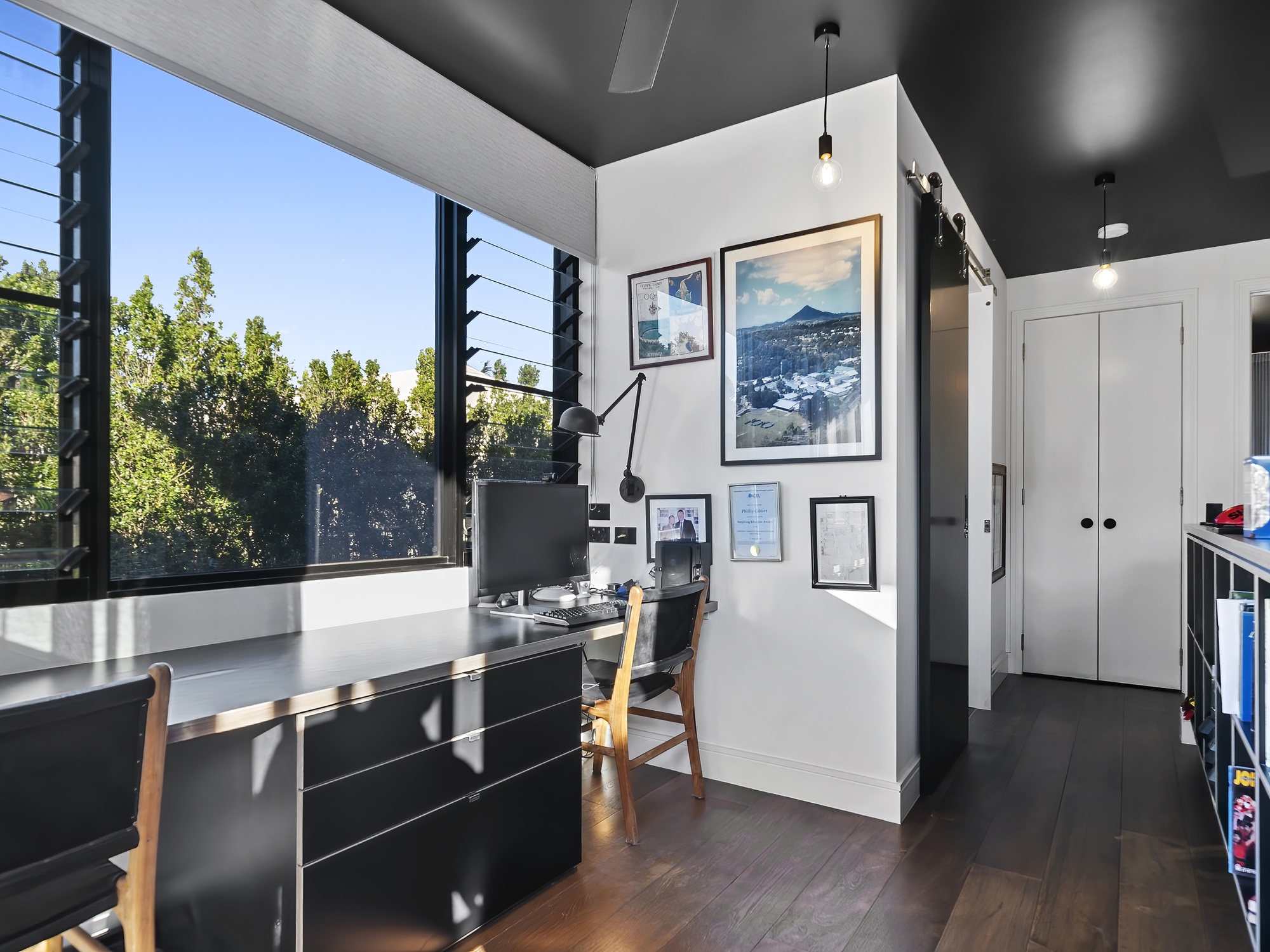 The upper floor houses a luxurious king suite with custom cabinetry, delicate silver-grey curtains, pool views, a walk-in robe, and a stylish white-tiled ensuite with stone-topped timber cabinetry. A powder room and a mezzanine walkway lead to a unique wing with an office, a bedroom with a built-in robe, and a bathroom. In total, the home offers five bedrooms, three bathrooms with a bonus lower level studio and pool house creating a private oasis next to lush gardens and a resort size pool.