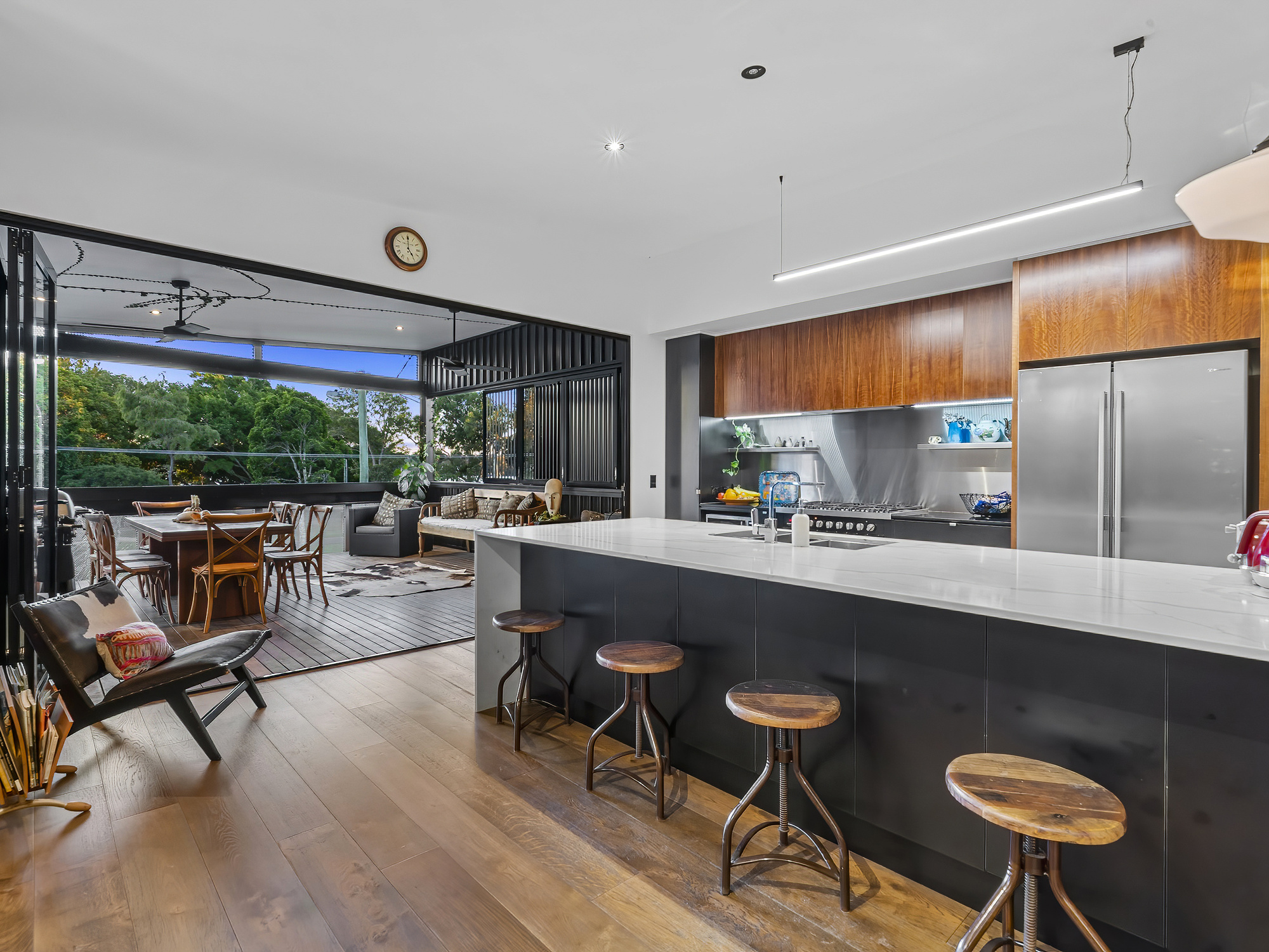 The expansive galley kitchen is a culinary enthusiast's dream, with stone-topped cabinetry, a long island breakfast bar, a stainless steel splash-back and top-of-the-line appliances, including a six-burner gas cooktop.