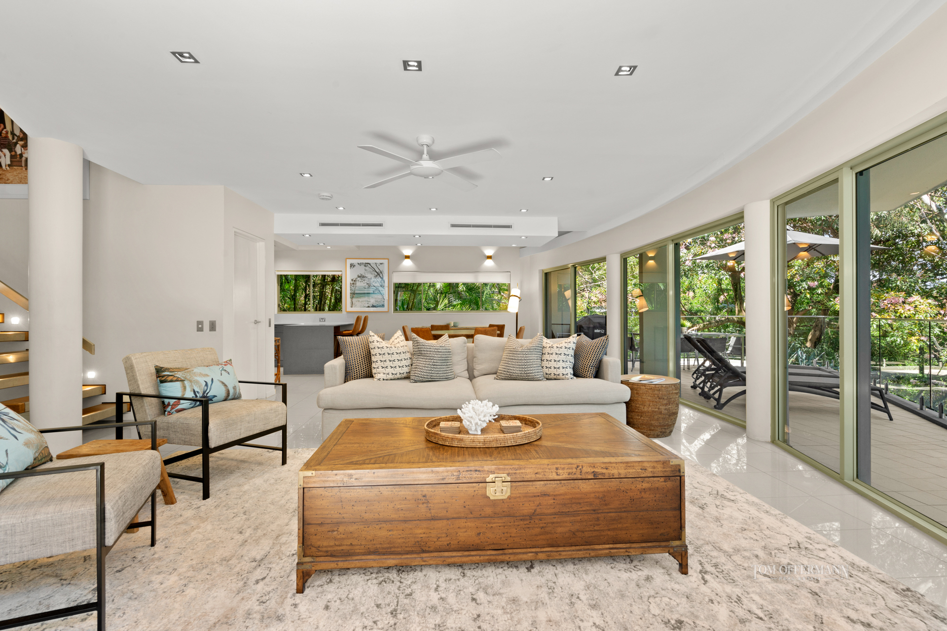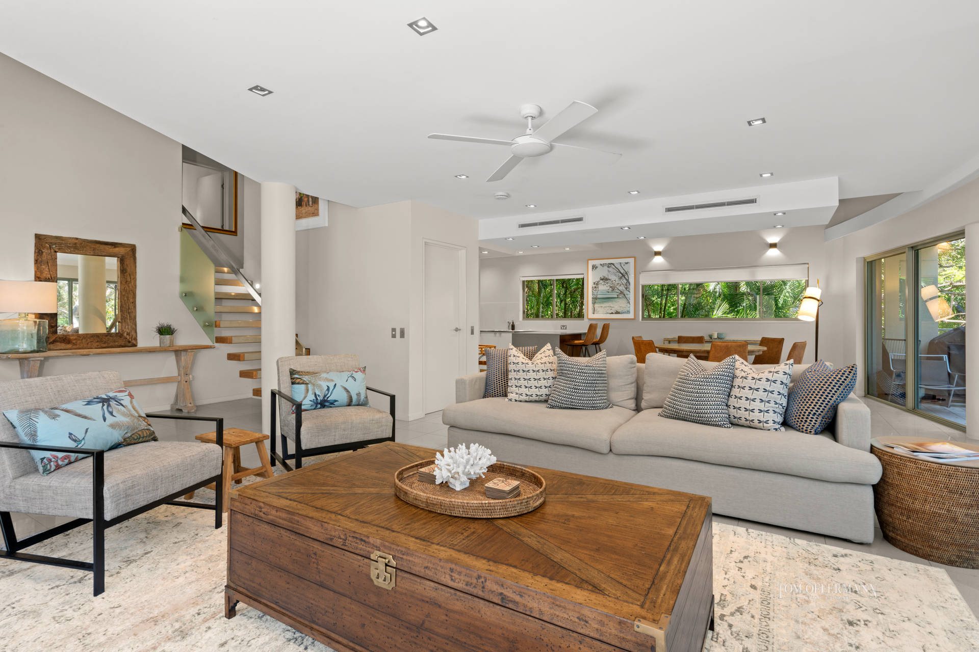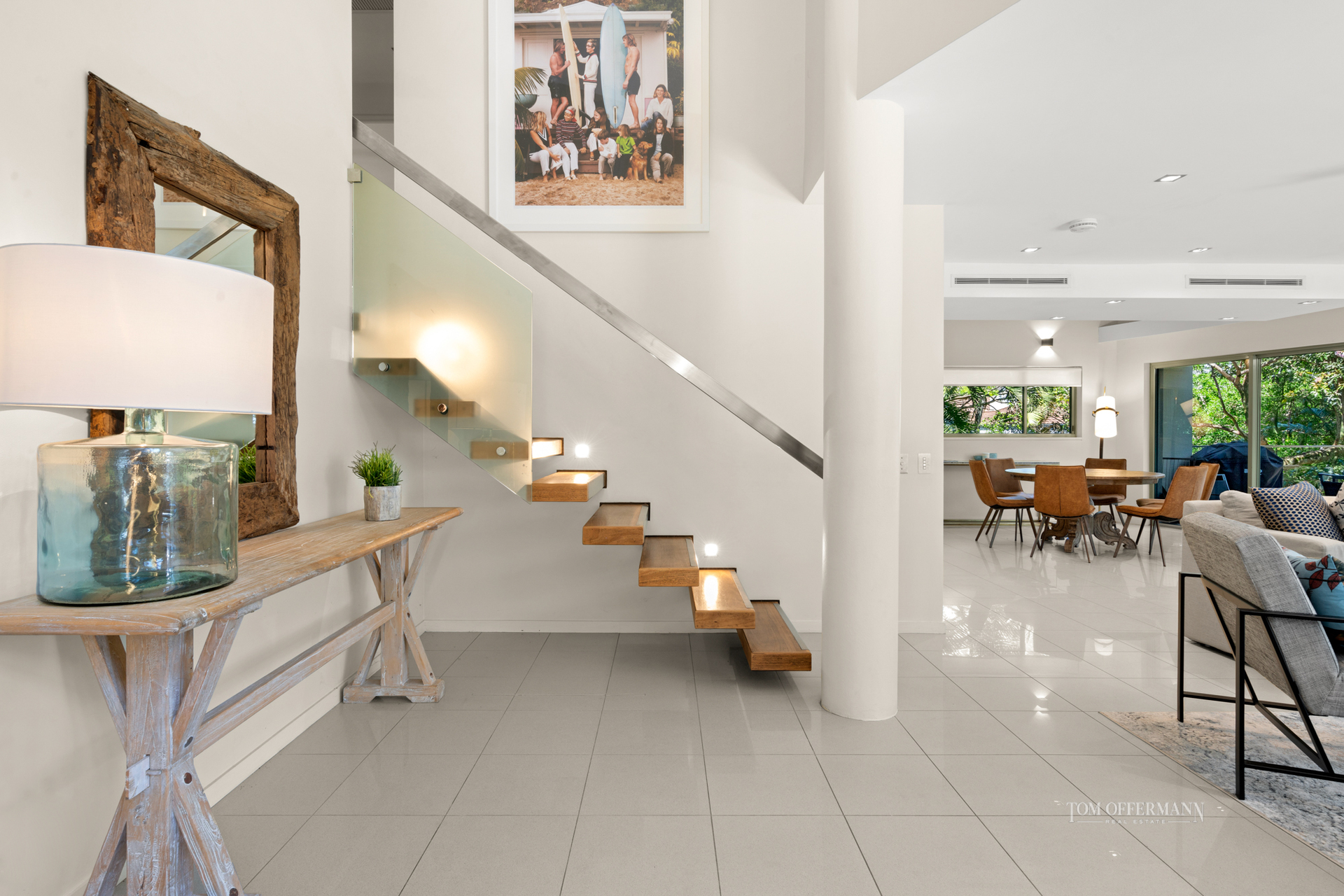 • About: access via lift or single set of stairs to exclusive 1st floor front door; secure garage & storage, 3-levels; sand-hued tiles throughout/carpeted bedrooms; storeroom/laundry w washer & dryer; ducted air conditioning & fans; lofty ceilings + voids; designer furniture incl Caribbean extension European timber finished with salvaged oak dining table, chest-style coffee table; leather dining chairs & bar stools, sumptuous sofa + artworks